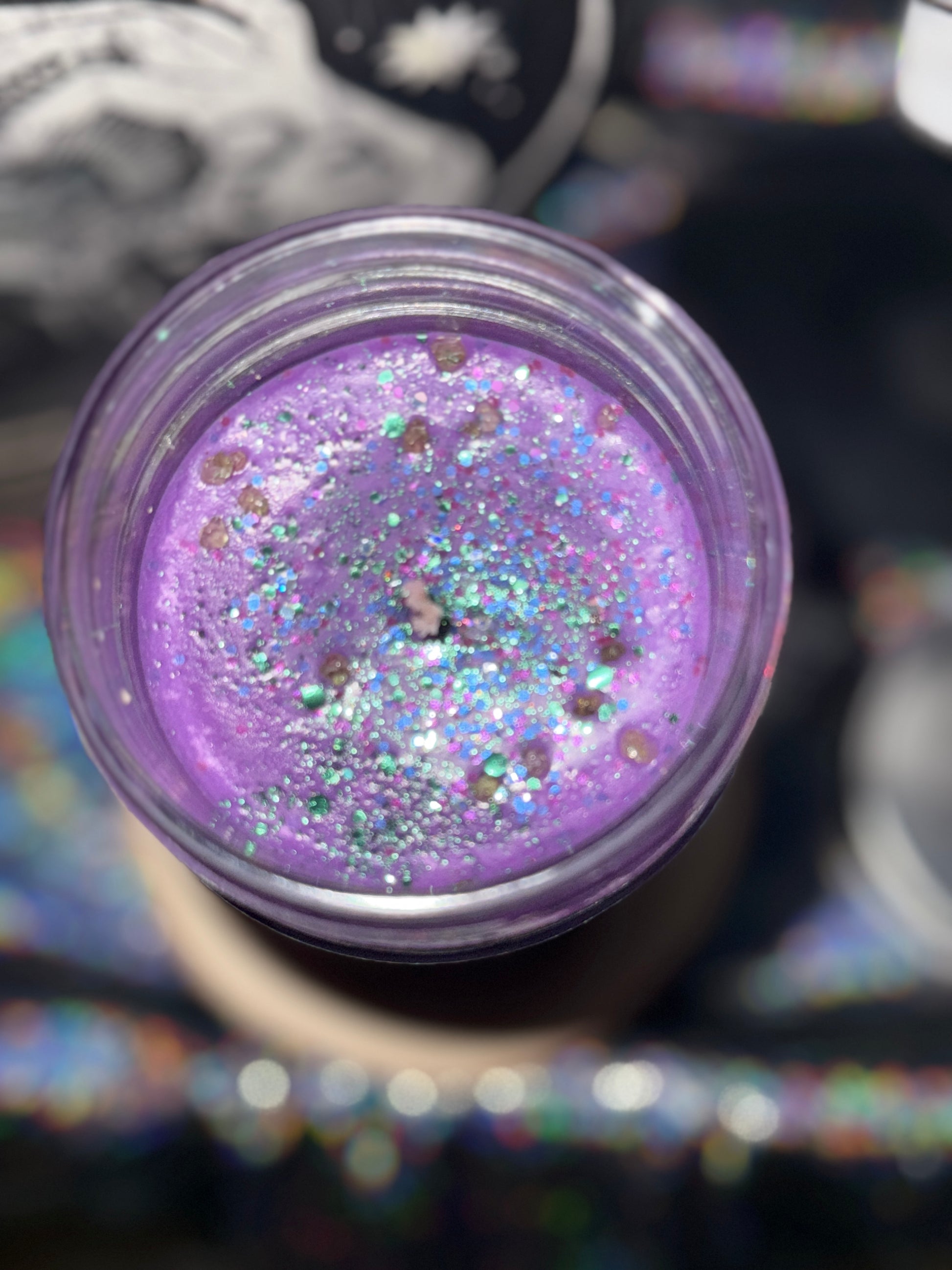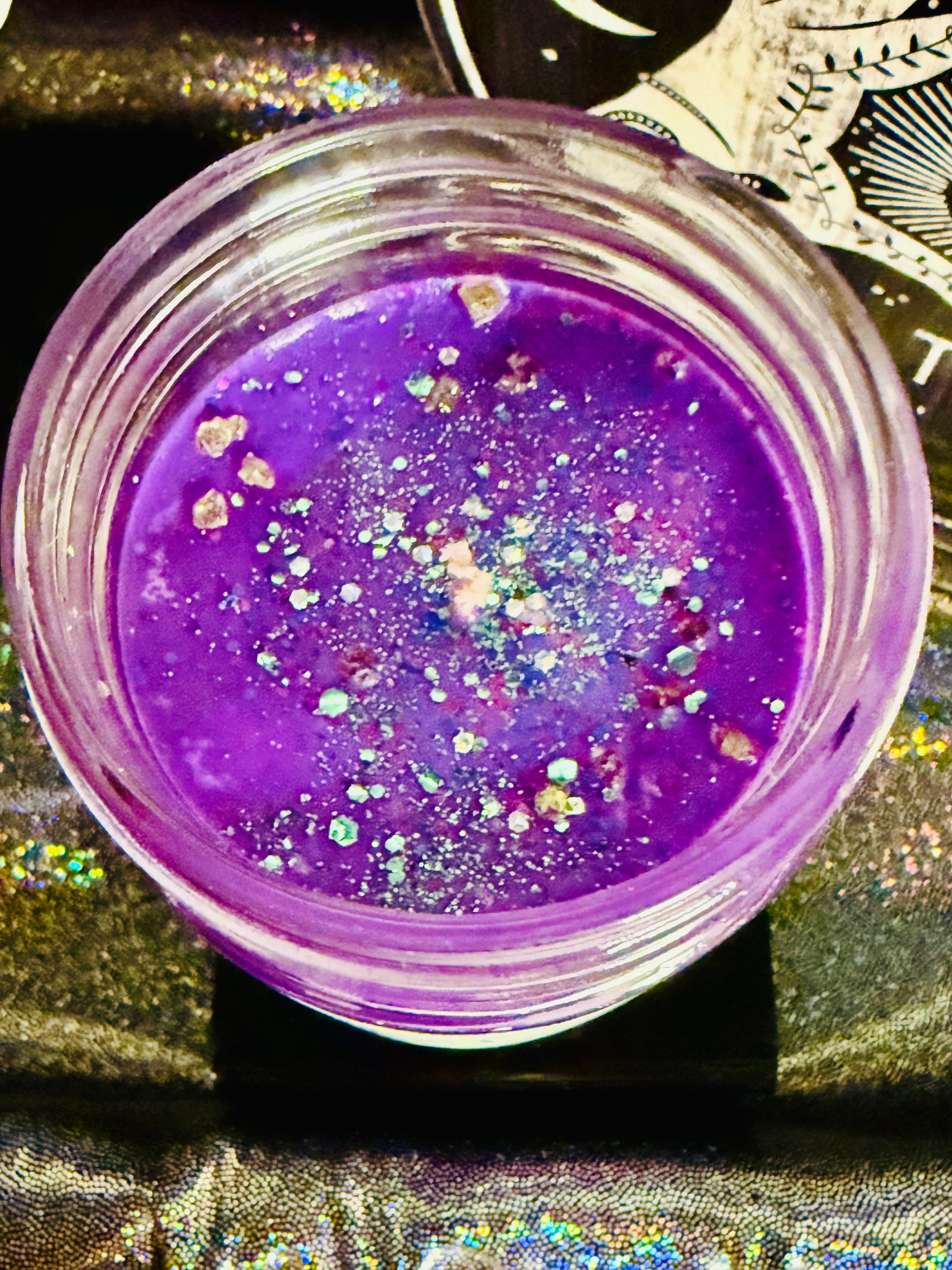 Some candles are created using bio-degradable glitter (non-plastic), dried herbs, dried flowers, and candle wax dye