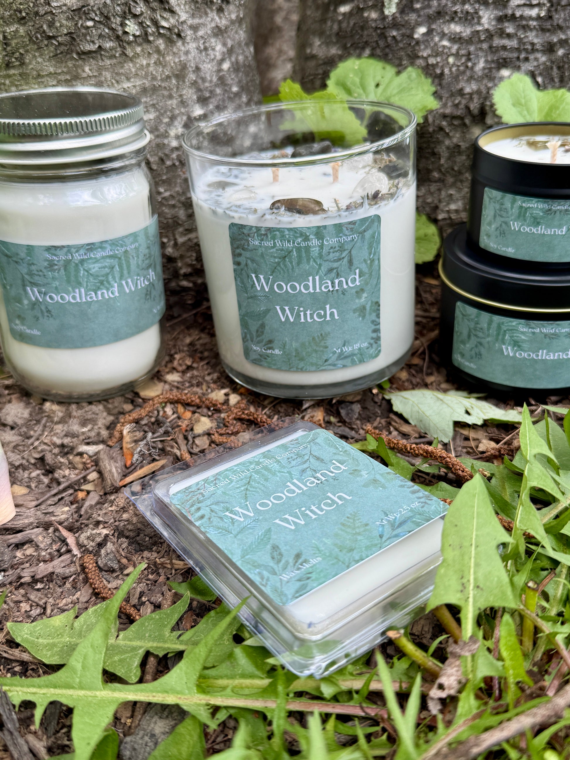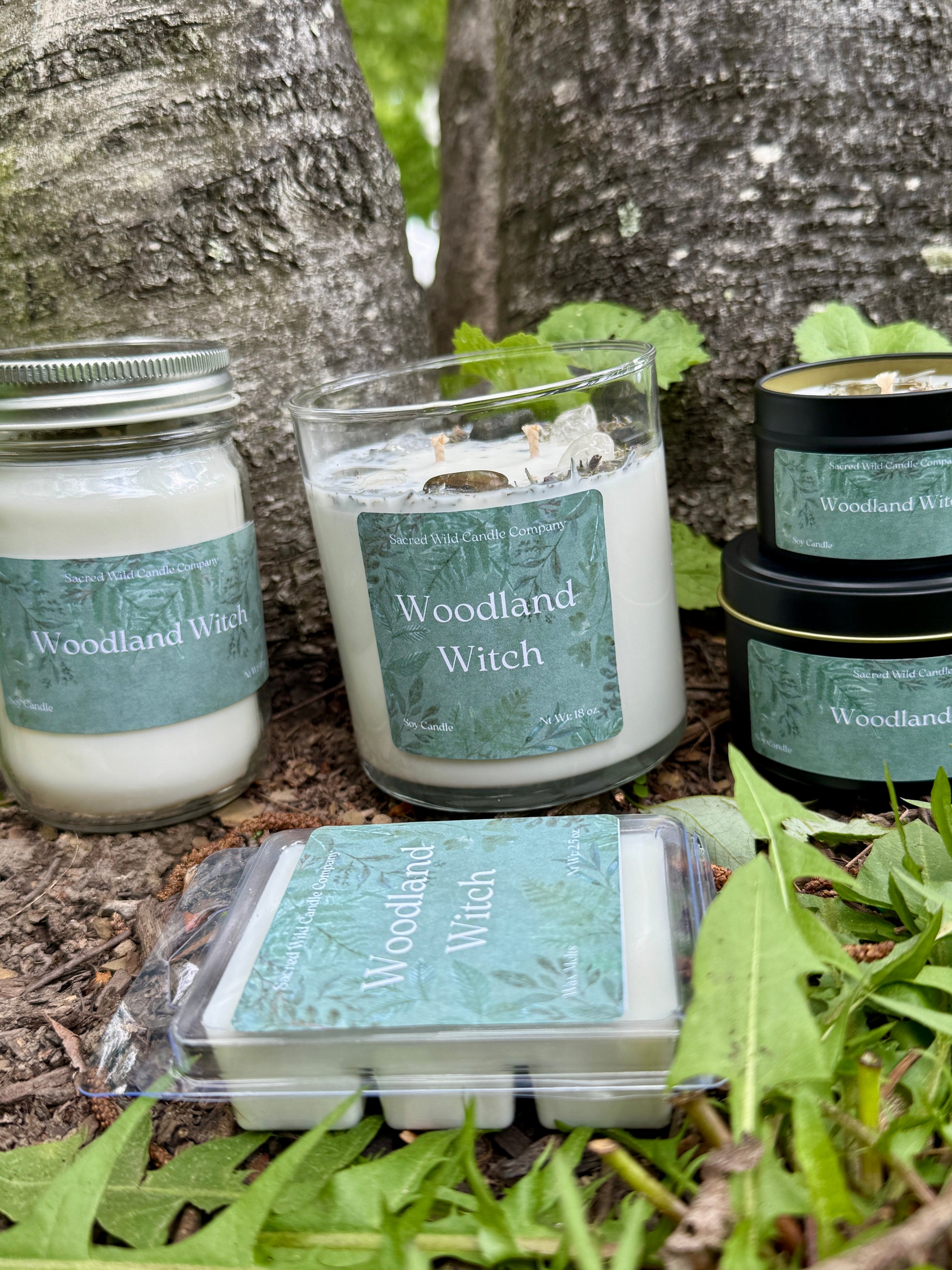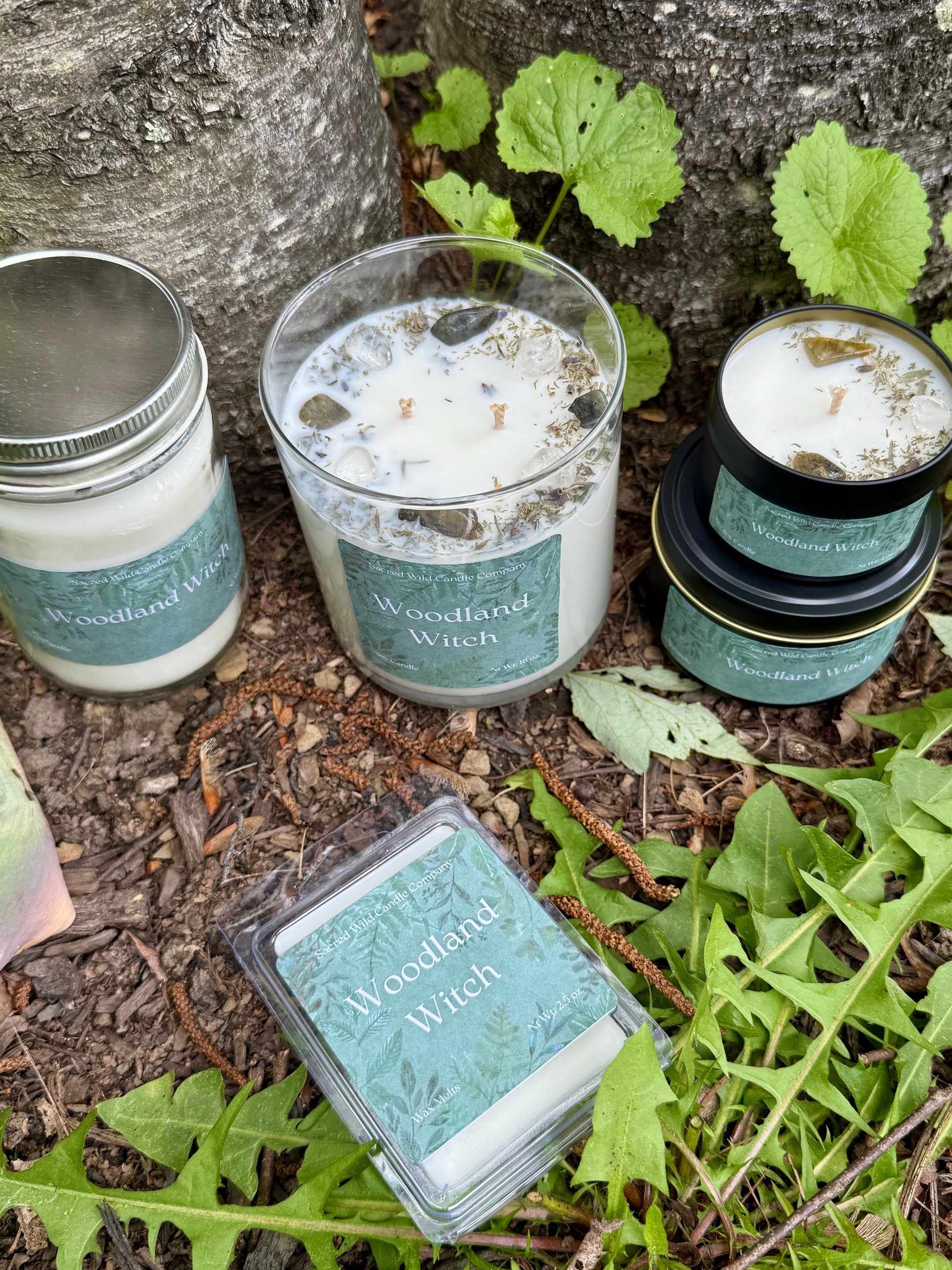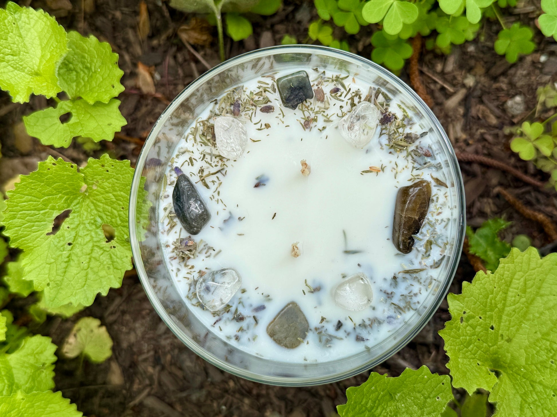 Scented with woodland foliage and decorated with labradorite, clear quartz, wild lavender, and dandelion root.